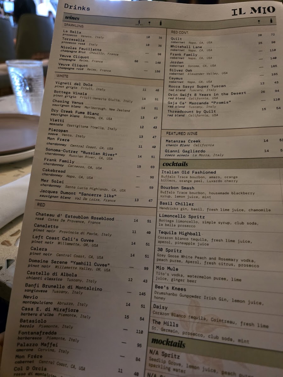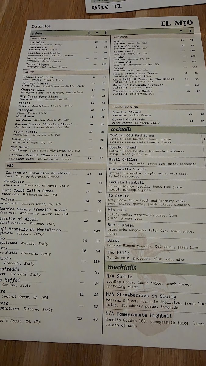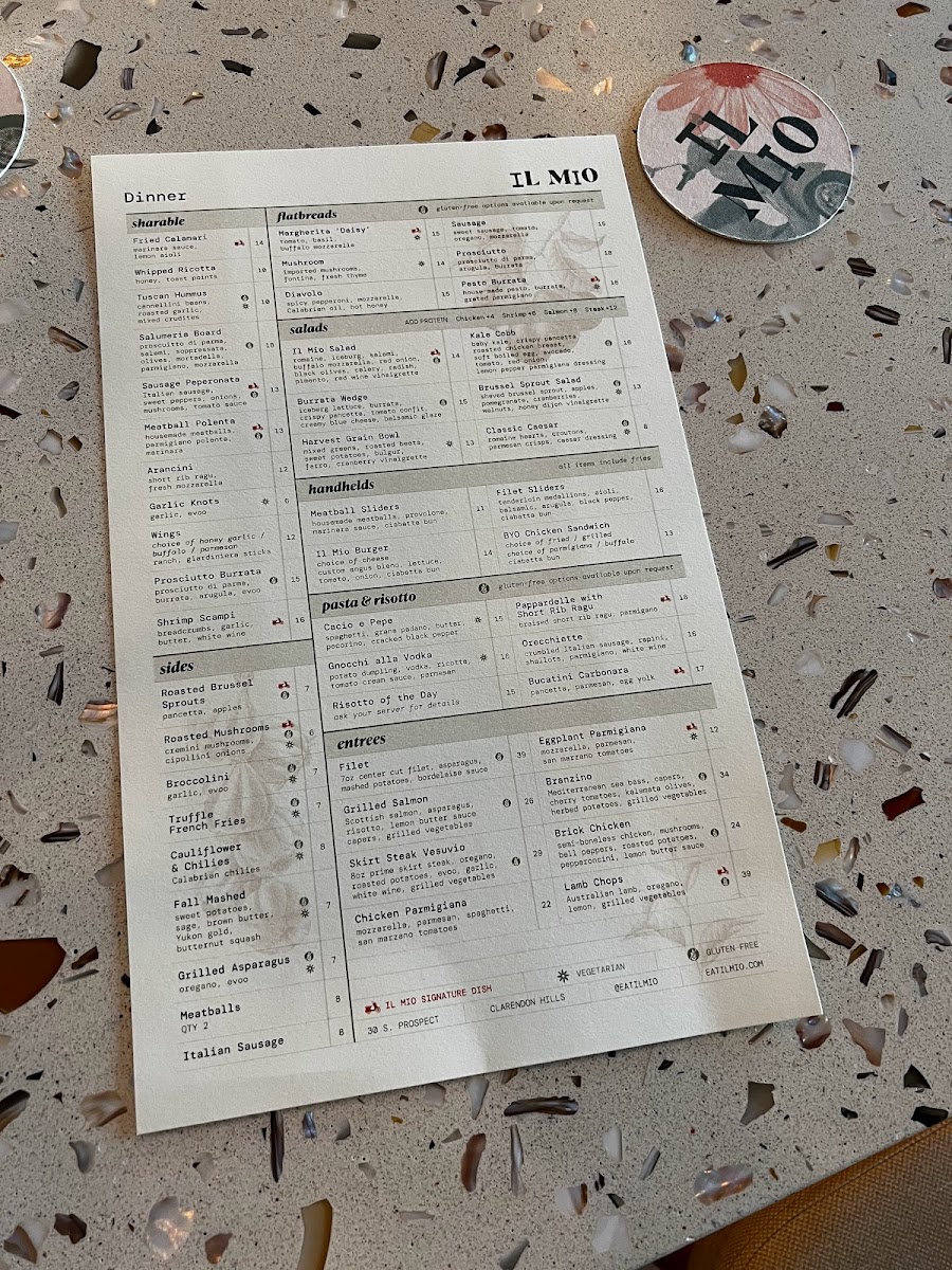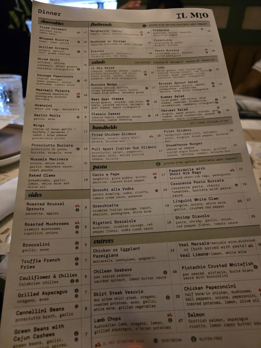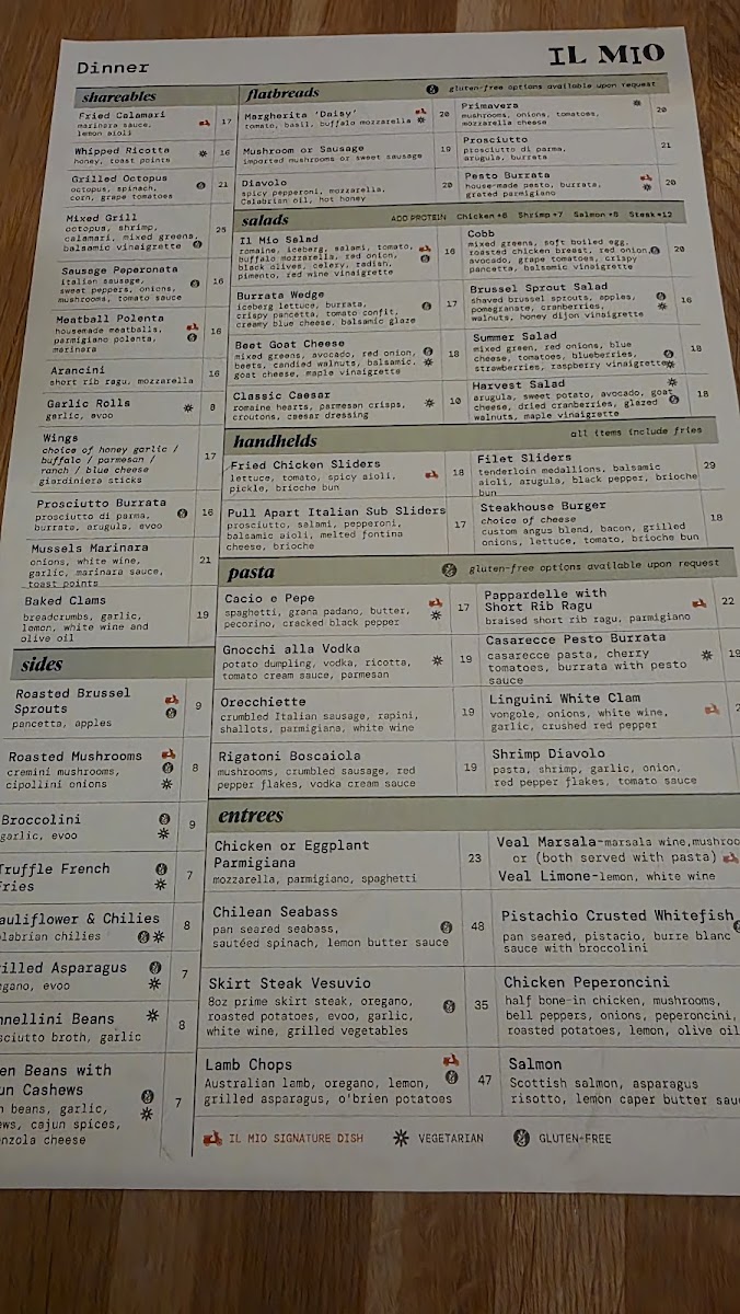 Wrapping up my look at Il Mio Italian Restaurant’s menu at 30 S Prospect Ave in Clarendon Hills, it’s clear the kitchen leans into familiar Italian comfort with a few steak-and-seafood “night out” moments. For sharing, the lineup is built to start strong-Mixed Grill, Grilled Octopus, Wings, Fried Calamari, and Toast Points set a crowd-friendly tone before you commit to a main. If you’re craving something handheld and casual, options like the Fried Chicken Sliders, Steakhouse Burger, Filet Sliders, Chicken Pesto Sandwich, and Italian Sub Sliders make it easy to keep things simple without skipping flavor. The entrées read like the menu’s heart: classics such as Chicken Limone, Chicken Parmigiana, and Eggplant Parmigiana sit alongside richer plates like Skirt Steak Vesuvio and seafood standouts including Chilean Sea Bass. Pasta lovers are covered with choices that range from creamy to briny-Rigatoni Vodka Sauce, Linguini Florentine With Shrimp, Asparagus Risotto, Linguini White Clams, and Rigatoni Boscaiola-plus customizable add-ons like Side Of Pasta: Side Of Spaghetti, Side Of Elbow, Side Of Rigatoni, Side Of Rotini, and Side Of GF Pasta. There’s also plenty for families, thanks to the Kids Menu featuring Kids Salmon, Kids Salad, Kids Chicken Tenders, Kids Gelato, and Kids Butter Noodles. Flatbreads-Margherita Flatbread, Diavolo Flatbread, Prosciutto, Arugula, And Burrata Flatbread, Cheese Flatbread, and BBQ Short Rib Burrata-round out the middle ground between snack and meal, while sides like Side Of Polenta, Toast Points, Fries, Cannellini Beans, and Spinach & Beans help you tailor the table. End on a sweet note with desserts such as Panna Cotta, Side Of Berries, Italian Lemon Cake, Tiramisu, or Italian S'mores, and if you want something lighter earlier on, the soup-and-salad section-Burrata Wedge, Il Mio Salad, Harvest Salad, Cobb, and Classic Caesar-keeps things balanced. Overall, it’s a well-rounded menu that can flex from quick bites to a full celebratory dinner.